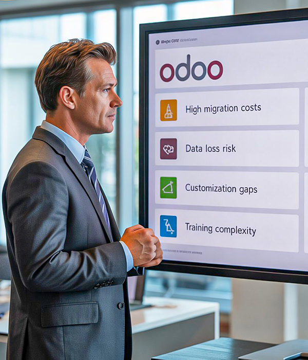 Businesses often face difficulties in selecting an ERP/CRM provider, high migration costs and risking data loss when adopting these systems. Without appropriate customization of Odoo to meet business needs and provide timely support & resolution of unresolved issues linger for much too long; training employees & integrating existing tools add an extra level of complexity that complicates transition processes further for businesses to navigate successfully.
